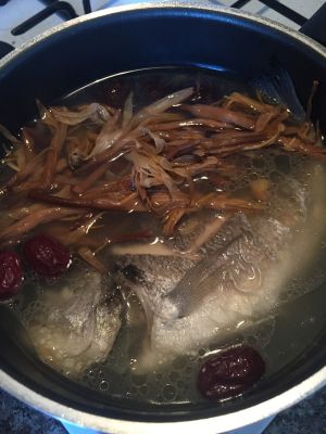 大火把鱼汤烧开后加入红枣和泡发好的香菇