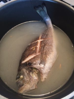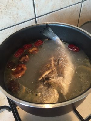 把姜和葱白塞鱼肚子,锅里热油把鱼两边都煎至颜色变金黄,加入冷水将汤煮至奶白色