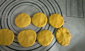 把蒸熟的南瓜加入粉和糖一起和成团后下剂子揉成圆饼。