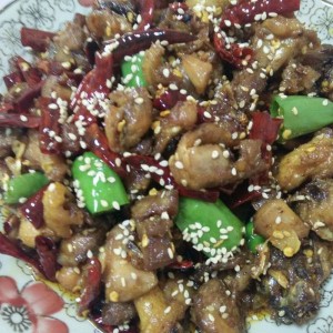 先把鸡肉宰成小块,辣子鸡必须小块,不然不容易熟和入味,这是没有改刀的大坨鸡肉。