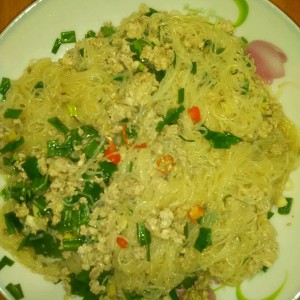放两碗水煮粉丝,中途放盐,生抽,最后加入肉末翻炒,加点葱花装盘