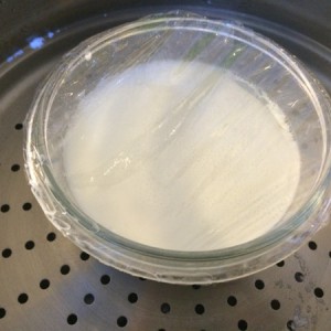 覆盖上保鲜膜,入蒸锅中小火蒸熟,我这里用温水下锅蒸的,节约一些时间~蒸约半小时,用的米技电磁炉,放心去洗澡了~