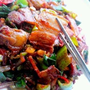 肉煎好盛出。锅内用煎肉的油放入青红椒,蒜,豆瓣酱炒出红油,然后放入肉,蒜苗,洋葱,加糖,生抽,出锅。因为豆瓣酱有咸味所以不用放盐,加糖中和下味道也不要多。