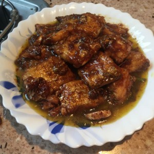 将煎好的带鱼捞出把多余的油沥出,锅内放切碎的生姜、葱末,少许油大火加热放入带鱼,陆续加料酒、生抽、老抽、糖、醋、少许开水!盖锅焖两分钟,加入鸡精出锅!