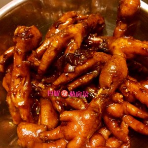 锅中放底油,葱姜爆香,放入处理好的生鸡爪;烹入料酒;略翻炒后,倒入调好的酱汁;加水到略没过鸡爪;顿15~20分钟收汁至粘稠