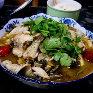 泡椒切断,小火热油下入葱姜蒜酸菜泡椒,鱼头鱼骨出香味,加入开水,熬出味后捞出鱼块酸菜等,下入鱼片颜色发白卷起来后,就倒入装鱼块的碗,热油放入花椒干辣椒出香味后倒入到铺上葱节的碗里