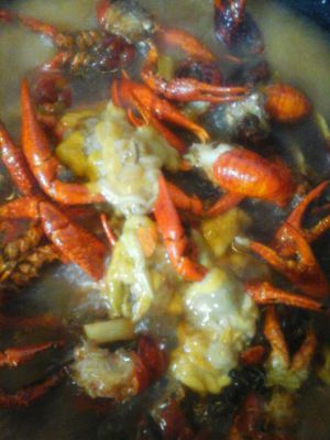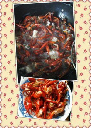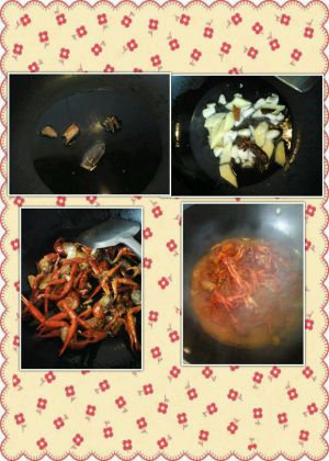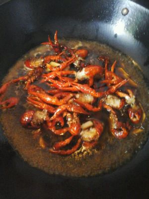 锅里放油 下八角桂皮 下姜片蒜末 煸香下炸过的小龙虾 稍稍翻炒后放生抽3勺 料酒2勺 加足够量的开水 水开大火稍煮转中小火煮才能入味
