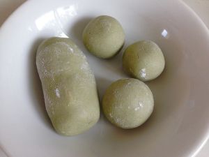 煮汤圆的时候,水烧开放汤圆,有稍微浮起来的时候,加一次凉水。最后汤圆全部浮起来的时候就可以吃了。巨大的那个漏了,就没有图。三个小的在控干水份后,薄薄地撒上抹茶粉,做成中西合璧的糯米团子。