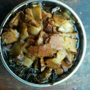 3豆腐乳抹到肉上面,抹均匀,把酸菜放到上面,放到蒸锅里面加足够的水,先大火,水开后小火蒸两个小时或者一个小时!时间越长肉越入味,豆腐乳够咸所以不用加盐了!出锅后把碗扣过来就可以了!