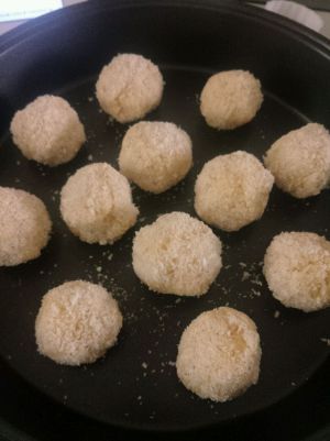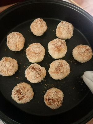 用手轻团成球然后外面滚上一层椰蓉粉,注意不要捏实。