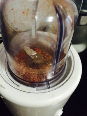 把干辣椒切碎,放到料理机打碎。倒入耐热的碗里。