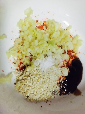 把生姜和大蒜切碎,放料理机打碎。加一勺蚝油,一勺酱油,一小勺盐。一把白芝麻。
