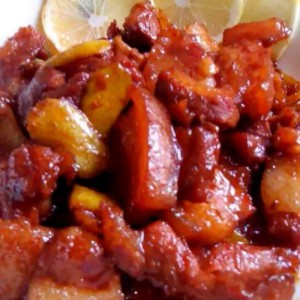 热油下姜蒜爆香,下腌好的肉翻炒出油。挤入柠檬汁。