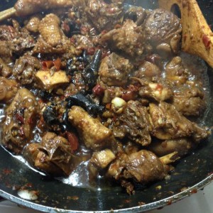 然后炒鸡,锅里多放点油,把大蒜 姜 辣椒 八角 花椒 爆香,然后到入鸡爆炒,超不多以后到老抽和生抽再少许盐。 加水开始炖一下。