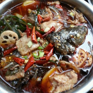 锅中加水倒入一袋麻辣香锅底料煮开,先放入鱼头煮熟,再倒入焯好的菜稍煮一下,一便倒入容器。