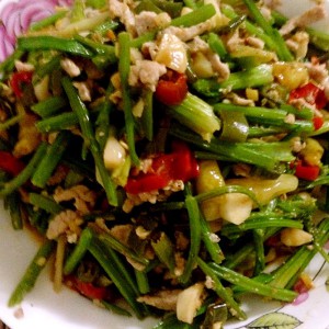 热锅热油放入大蒜 蒜苗爆香加入肉丝翻炒加入豆瓣酱 酒酿翻炒断生再放入芹菜 翻炒再加入辣椒泡椒翻炒 最后放入盐 鸡精 酱油调味即可出锅