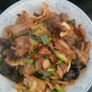 锅里放一点油把肉片放锅里炒(肉会出油所以不用放太多油)炒到肉片有点卷起放豆瓣酱,白糖,料酒,十三香翻炒。