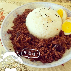 1.5小时候开始煮饭,饭跳至保温后,将电炖锅中的肉末倒入烧热的炒锅,大火收汁,浇在摆盘后的米饭旁即可。卤蛋切开,饭撒上黑芝麻。