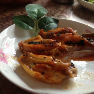 烤箱预热200度,中层烤15分钟取出,刷点腌料,翻面再刷一层腌料,入烤箱继续烘烤5分钟