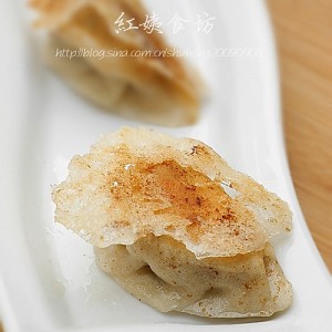 煎至冰花变微焦。左手拿盘子倒扣在饺子上面,右手将平底锅翻转180度倒扣在盘子上