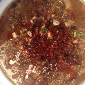 按顺序,撒葱花、炒好的胡辣子、干辣椒面。