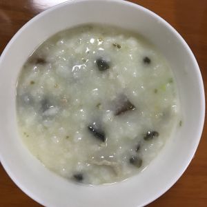 米煮的差不多快熟时加瘦肉,再加一个皮蛋,不停翻搅