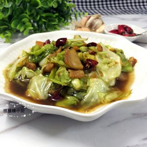 这时可以把软化了的包菜倒进炒锅中翻炒,软化了的包菜很容易熟,所以不能炒太久