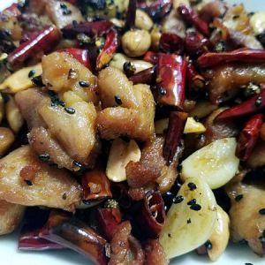 鸡腿剔骨,肌肉切均匀小丁,放盐,淀粉,料酒,生抽,腌渍时间长点……油炸,复炸后沥油,干辣椒用水冲一下,切圈,小火烘焙干红椒,花椒,大蒜,姜片,炒出香味后倒入鸡丁,加点糖,芝麻,出锅