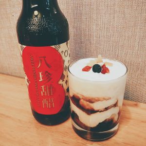 4. 把备用的八珍酱汁倒入杯底,然后将海绵手指饼放入杯中,再加上一层姜汁奶油,重复2次。看个人喜好,最后撒些可可粉或水果干在最上面就完成。放进冰箱冷藏,要吃时拿出便可。