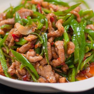 锅中留底油将青椒炒熟倒入肉丝,加盐和豆瓣酱调味。