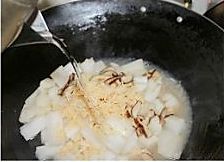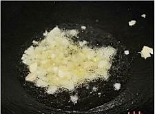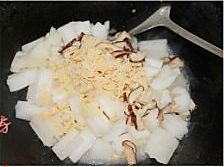热锅下油爆香蒜蓉下萝卜大火翻炒3分钟;