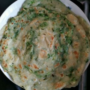 然后压平,用擀面杖擀成圆饼,锅里放入适量油,把饼平铺如不粘锅里,待饼定型了开小火,翻面煎一下,等两面金黄了就可以吃了。也可以加鸡蛋和培根。