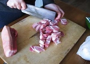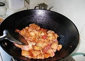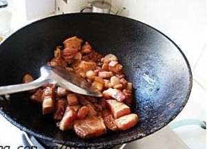 先把铁锅里加白糖,烧到白糖冒泡的程度,等到白糖变色要开始冒烟时马上把肉扔进锅里。注意一滴油不要放啊,炖的过程就会出油的。然后不停地翻啊,炒啊,炒到肉开始变干上色的程度