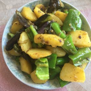 倒入炸好的土豆跟茄子,继续翻炒,加少许水,盖上锅盖焖1分钟