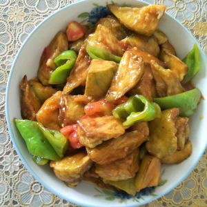 锅里倒入少许的油,加入切好的西红柿,尖椒。翻炒1~2分钟,在倒入装盘备用的茄子。最后加入盐,白沙糖,淀粉水,翻炒一分钟即可