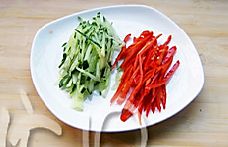 红椒去蒂和籽,洗净切成丝,黄瓜切丝。