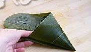 把粽叶眷卷成三角状,放入拌好的菜,装盘即可