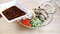 白玉菇、蟹味菇、红椒丝沥干水后,与黄瓜丝一起倒入大碗中