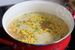 速冻的甜玉米粒、新鲜的胡萝卜丁、甜豌豆放到开水里煮熟。