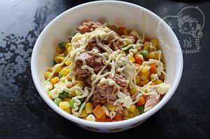 把煮好的玉米蔬菜粒放到大碗里面,再放上金枪鱼碎撒上沙拉酱拌匀就可以享用了。