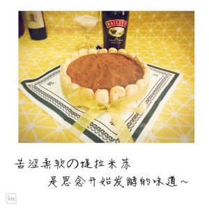 盘子里倒入百利甜酒,手指饼干蘸满酒盘在盘底,倒入一半奶酪糊。然后再放一层手指饼干,最后再到完奶酪糊。放入冰箱冷藏六小时以上。
