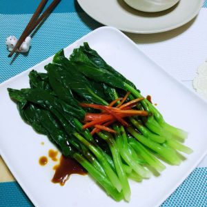 把芥兰挤去多余水分装盘把调和的蚝油汁浇入芥兰