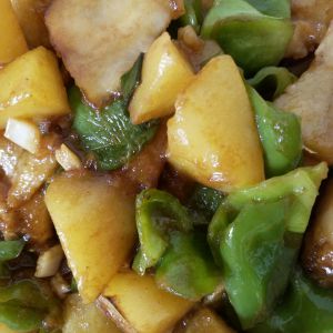 茄子削皮,和土豆一起都切成滚刀块,将茄子放入淀粉里滚动,让茄子均匀的粘上淀粉,用平底锅倒油,放入土豆块煎到金黄,然后再煎茄子,同样煎到金黄色,青椒切块备用