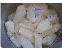 把竹荪放在盐水中浸泡20分钟,去掉头和尾。再用清水冲次几遍。