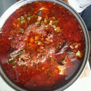 先炒葱姜蒜料爆香,再加火锅料,加水煮开,中间放了点冰糖提鲜。
