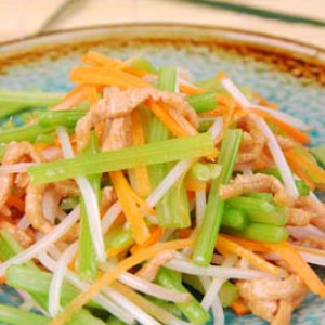 锅中加油,待油热后放入姜末、里脊肉翻炒,将胡萝卜、芹菜、银芽一起放入锅内翻炒后加盐、糖、鸡粉调味,炒熟装盘即可。