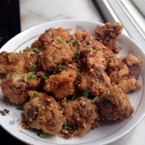 然后锅中放油(多些),待油熬热后将排骨一一放入煎炸,等排骨两面炸黄可转小火慢慢炸至深黄色可捞出备用,这是可以切蒜末,切5颗大蒜就可以啦