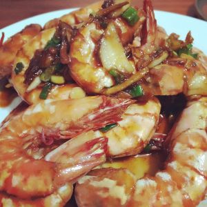 油下锅,爆虾出虾油,放入调料(蒸鱼酱油,番茄酱,糖,陈醋)、大蒜、姜焖10分钟,收汁加葱,ok