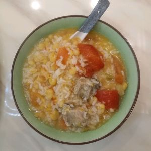 泡好的豌豆和番茄丁,番茄块入高压锅,加入排骨原汤压至豌豆开花。然后将豌豆番茄汤盛出入锅,加入煮好的排骨和米饭小火熬炖5分钟入盐和鸡精即可,再洒上少量葱花,配上小碟泡菜,色,香,味俱佳,一定能吃完满满的一碗。