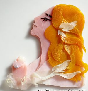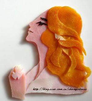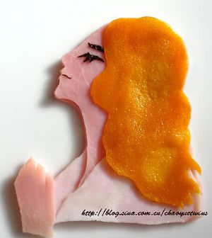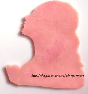 透写时另做一份整体图,剪下来,盖在火腿片上用食品专用小刀切出形状做底衬。